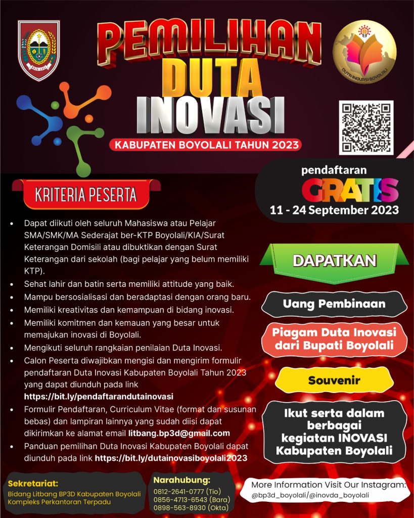 Dalam rangka mendukung kemajuan di bidang Inovasi dan teknologi melalui promosi inovasi, Pemerintah Kabupaten Boyolali menjadi lokomotif Kabupaten yang pertama kali mencetuskan ide dilakukannya pemilihan Duta Inovasi. Pemilihan Duta Inovasi Kabupaten Boyolali dilakukan melalui 2 metode, yaitu penunjukan langsung dan seleksi terbuka. Penunjukan langsung dilakukan oleh BP3D Kabupaten Boyolali berdasarkan pemantauan kegiatan inovasi dan pertimbangan yang matang. Pemilihan Duta Inovasi yang dilakukan secara seleksi terbuka dapat diikuti oleh seluruh Mahasiswa atau Pelajar SMA/SMK/MA/Sederajat ber-KTP Boyolali/KIA/Surat Keterangan Domisili atau dibuktikan dengan Surat Keterangan dari sekolah (bagi pelajar yang belum memiliki KTP).